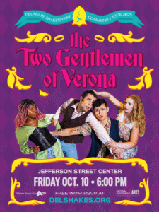 Reserve your space (or show at the door) and join us on Friday, October 10, 6PM for Shakespeare’s “The Two Gentlemen of Verona” – it will be great fun!