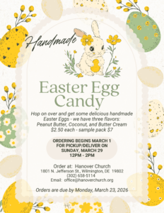 Our Easter Egg Project starts on March 1! We are selling delicious chocolate covered candy eggs at $2.50 each – butter creme, peanut butter, and coconut – you can also get a sample pack for $7.50. Call the church to place your order!